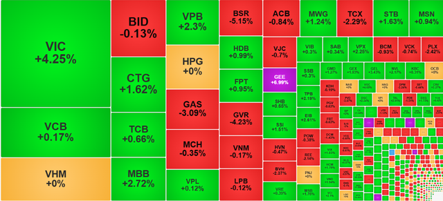Theo sau là TPB, DGC, VPB và MBB với mức tăng 2% đến gần 3%, các mã FPT, HDB, MWG, SSI, CTG, STB, với mức tăng 1% đến hơn 1,5%.