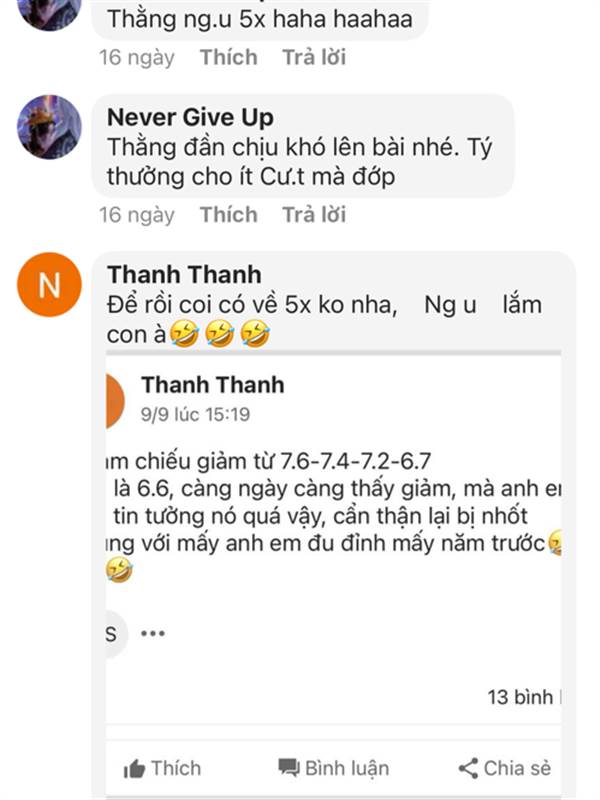 Thanh Thanh kêu giảm nó giảm, nói ko thấy nhục àh. 5 tháng rồi mà có khi nào về 4.5 ko. T cũng chẳng thiết hô hào tăng giảm làm gì. Chỉ thấy ngứa mắt với cái thằng éo có tý kiến thức nào hay thể hiện. Mở tk chứng...Thêm
