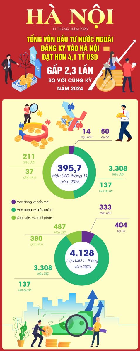 11 tháng năm 2025, vốn đầu tư nước ngoài đăng ký vào Hà Nội đạt 4,128 tỷ USD, gấp 2,3 lần cùng kỳ năm 2024. Trong đó, đăng ký cấp mới 404 dự án, với số vốn 333 triệu USD; 137 dự án điều chỉnh tăng, giảm vốn đăng ký 3.308 triệu USD, 380 lượt nhà đầu tư nước ngoài góp vốn, mua cổ phần đạt 487 triệu USD.