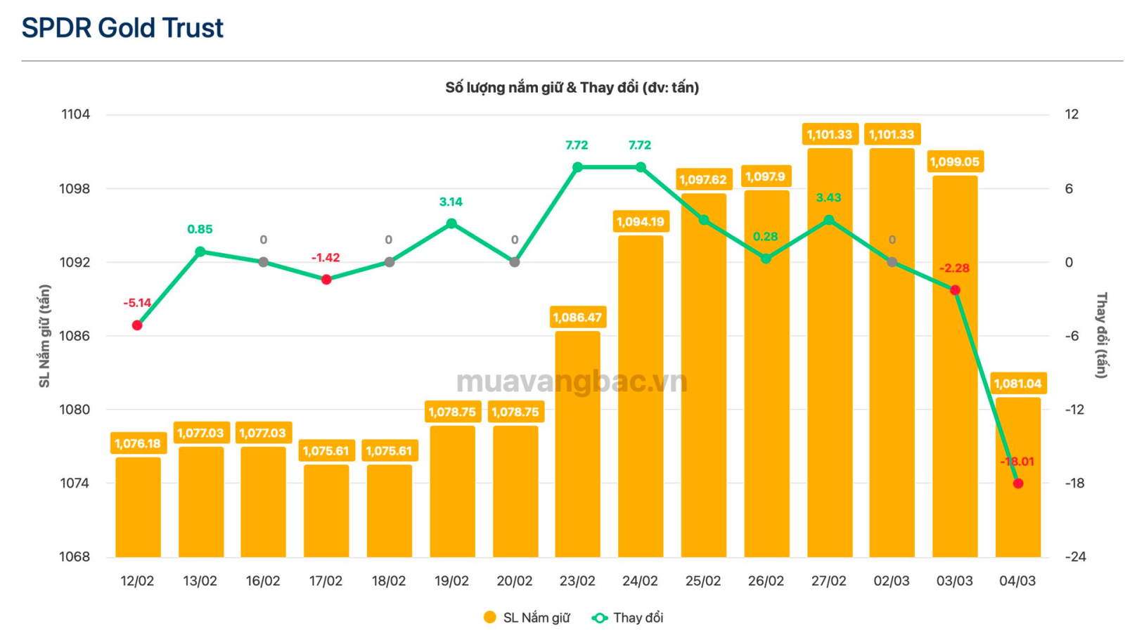 Theo dữ liệu cập nhật từ Muavangbac.vn, quỹ vàng lớn nhất thế giới SPDR Gold Trust vừa bán ra 18 tấn vàng trong ngày 4/3, ghi nhận khối lượng bán ra lớn nhất trong 13 năm kể từ tháng 4/2013.