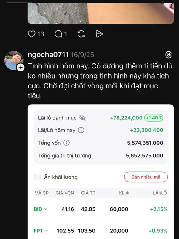 Ngoài FPT, hồi cuối tháng 8, đầu tháng 9 em ấy bảo ai mua SSI là mất ngủ, và mua MBS, VCI là ngủ ngon. Kết quả đến giờ: SSI hoà vốn, MBS, VCI lỗ 15%