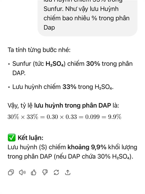 Long1610 Bao S chiếm tỷ lệ 10%. Nếu H2so4 chiếm 30% phân Dap thì tỷ lệ S chiếm khoảng 3% thôi giá vốn Dap.