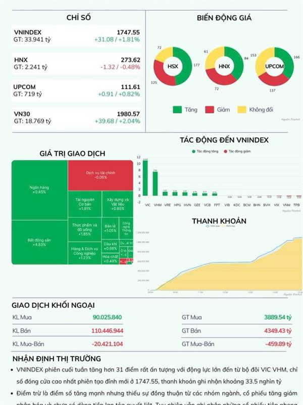 VNINDEX kết phiên tăng mạnh +31.08 điểm (+1.81%) lên 1,747.55 điểm, đánh dấu mức đóng cửa cao nhất trong nhiều phiên gần đây. VN30 cũng bứt phá +39.68 điểm (...Thêm