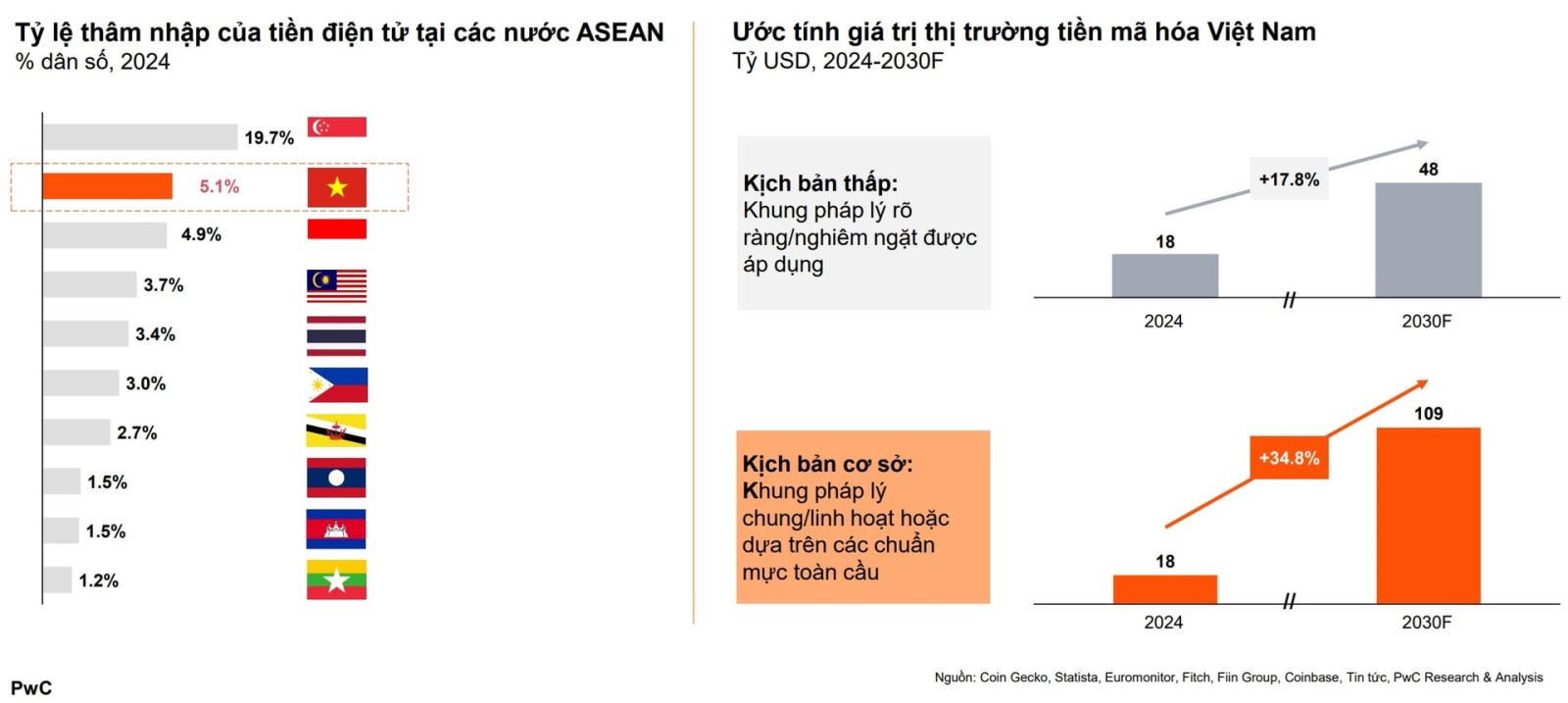 Nghiên cứu về thị trường tiền mã hóa, PwC ghi nhận Việt Nam nằm trong số các quốc gia dẫn đầu ASEAN về tỷ lệ thâm nhập thị trường với khoảng 5% dân số đã sử dụng tiền mã hóa, chỉ đứng sau Singapore (tỷ lệ thâm nhập khoảng 20%, được hỗ trợ với khung pháp lý hoàn thiện hơn so với các quốc gia khác trong khu vực).