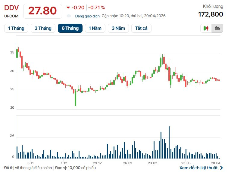 Trên thị trường chứng khoán, cổ phiếu DDV hiện giao dịch quanh ngưỡng 27.800 đồng/cổ phiếu, tương ứng vốn hóa doanh nghiệp xấp xỉ 4.000 tỷ đồng.
