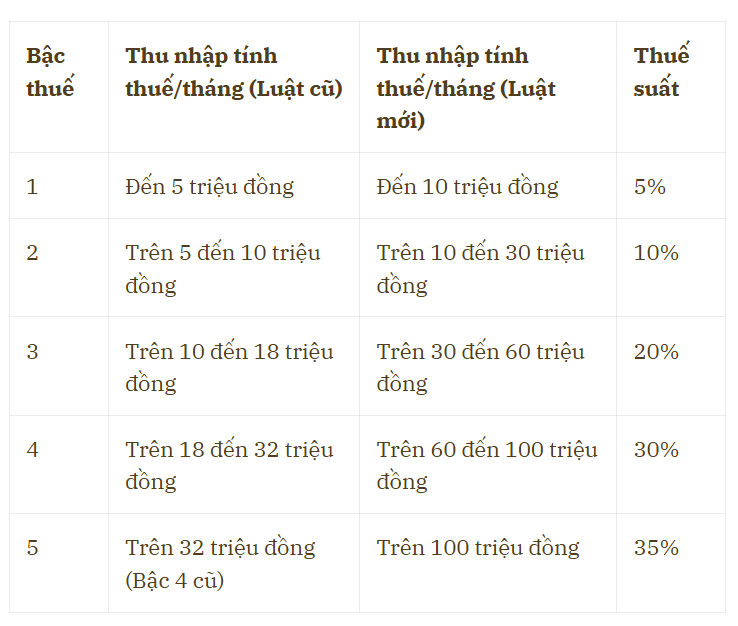 Luật sửa đổi đã rút gọn từ biểu thuế 7 bậc hiện hành xuống còn 5 bậc, đồng thời giãn rộng các khoảng thu nhập chịu thuế để giảm áp lực cho nhóm thu nhập trung bình.