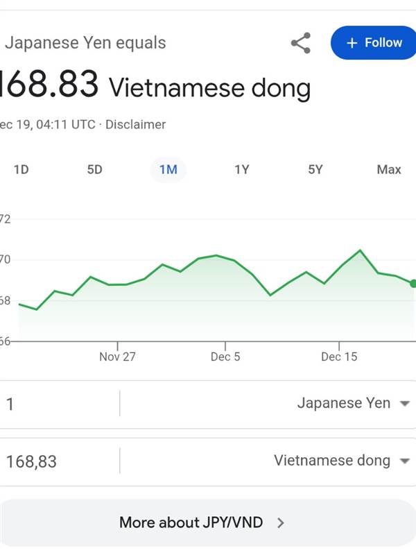 Thuong Nguyen tăng vẫn rất thấp kh như mong đợi.tỷ giá đang 1yên=168 vnd. Mức giá này giống như 2 năm trước.