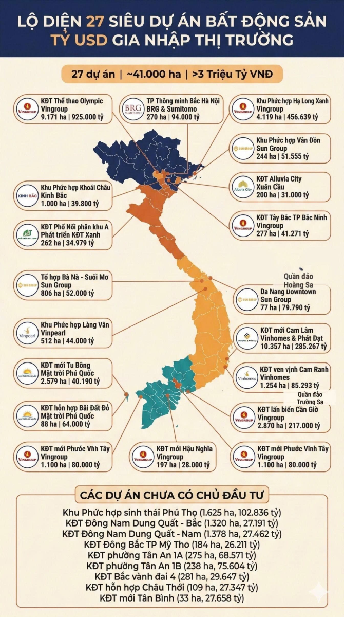 Dữ liệu từ danh mục các dự án tỷ USD gia nhập thị trường ghi nhận 27 dự án với tổng diện tích 40.826 ha và mức đầu tư 3.062.311 tỷ đồng. Nguồn vốn đang tập trung vào các vùng ven thông qua các tổ hợp đô thị đa chức năng .