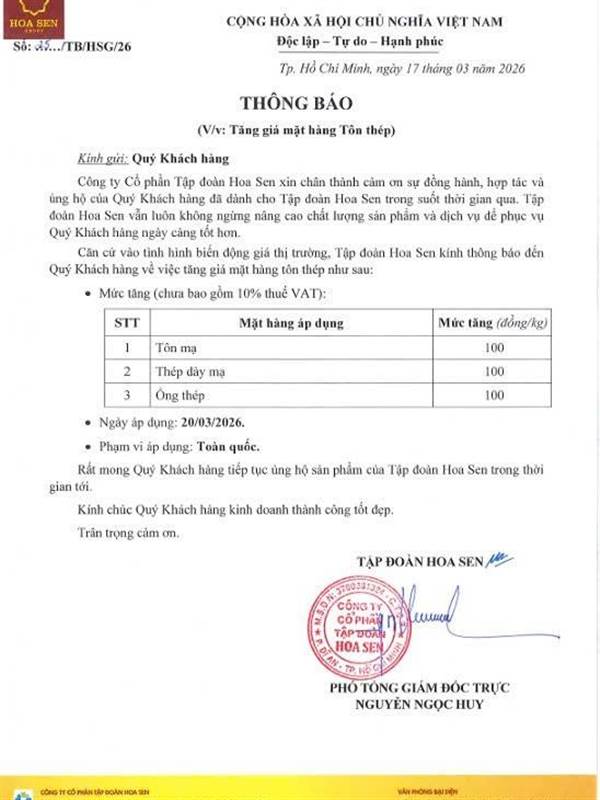 Theo thông báo từ Hoa Sen, nhà máy này tăng giá các mặt hàng lần 4 liên tiếp tính từ đầu tháng 3/2026 tới nay.