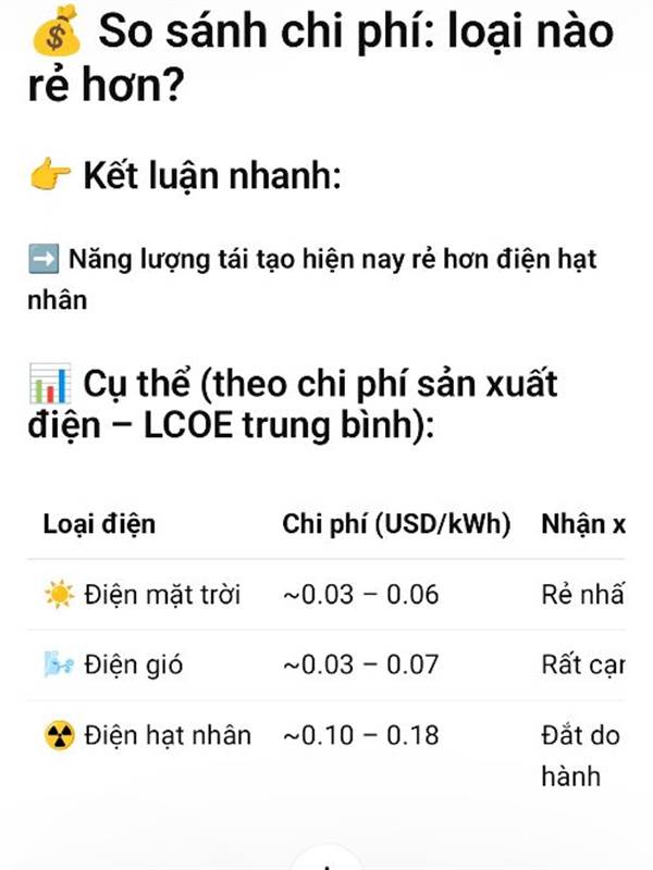 Nó ko rẻ nhât nhưng vừa rẻ vừa ổn định nhất, điên mặt trời là ít ổn định nhất, điện gió đỡ hơn xíu. Nếu có công nghệ lưu trữ(pin) ngon thì điện tái tạo là vô cùng ngon