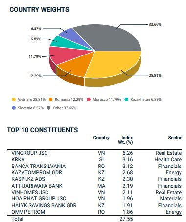 Tại ngày 30/1, Việt Nam vẫn là quốc gia chiếm tỷ trọng cao nhất trong rổ chỉ số của MSCI Frontier Market Index với tỷ lệ 28,81%. Xếp thứ 2 là Romania với 12,29%, Trong top 10 cổ phiếu chiếm tỷ trọng cao nhất, đại diện Vingroup (VIC) đứng top 1; theo sau Việt Nam cũng góp mặt 2 đại diện khác là Vinhomes (VHM) và Hòa Phát (HPG), lần lượt xếp thứ 7 và thứ 8.