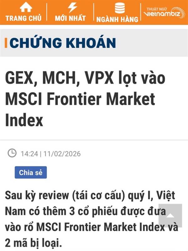 MSCI vừa công bố danh sách review tháng 2/2026 với bộ chỉ số quan trọng nhất của thị trường cận biên MSCI Frontier Markets Index. Theo đó, MSCI Frontier Market Index bổ sung tổng cộng 6 mã cổ phiếu và loại ra 6 mã. Trong đó, 3 mã cổ phiếu Việt Nam được thêm mới là Điện lực Gelex (GEE), Masan Consumer (MCH) và VPBankS (VPX). Chiều ngược lại, rổ chỉ số loại 2 cổ phiếu Việt Nam là KOSY (KOS) và Thép Nam Kim (NKG).