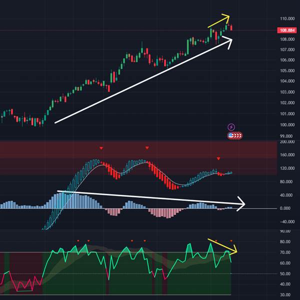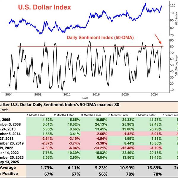 Chỉ số tâm lý thị trường (Daily Sentiment Index - DSI) đồng USD đang ở nghưỡng 80, cho thấy thị trường đang cực kỳ lạc quan (overbought) về sức mạnh của đồng USD