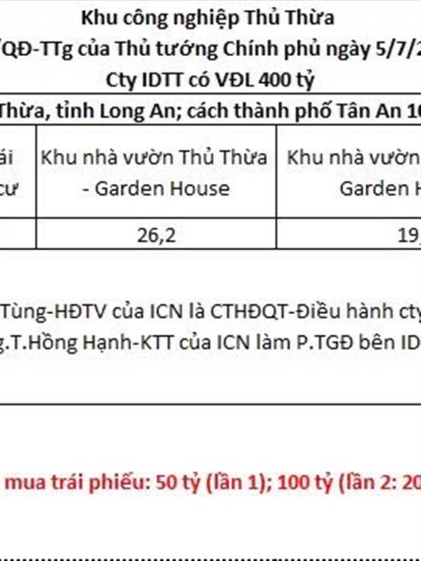 - Bạn quan tâm đến việc icn mua trái phiếu đầu tư vào Thủ Thừa nữa nhé. Việc chuyển đổi lấy dự án sẽ ko khó.