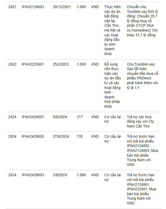 Không những thế, công ty cũng dùng một phần hoặc toàn bộ số tiền huy động từ các lô trái phiếu để chuyển tiền cho Trustlink vay, gồm: IPAH2124002 (giá trị 1.000 tỷ đồng, ngày phát hành 15/11/2021, kỳ hạn 3 năm, lãi suất 9,5%/ năm); IPAH2124003 (giá trị 1.000 tỷ đồng, phát hành ngày 20/12/2021 kỳ hạn 3 năm, lãi suất 9,5%/ năm); IPAH2225001 (1.000 tỷ đồng phát hành ngày 25/2/2022, kỳ hạn 3 năm, lãi suất 9,5%/năm).