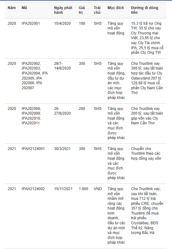 Tương tự, ở các mã trái phiếu IPA202008, IPA202009, IPA2020010 và IPA202011 tổng giá trị 200 tỷ đồng, kỳ hạn 2 năm, lãi suất cố định 10,5%/năm. Số tiền thu về được dùng cho Trustlink vay. Sau khi tất toán với Trustlink, IPA chuyển 300 tỷ đồng góp vốn vào CTCP Đầu tư và Phát triển Nam Cần Thơ.