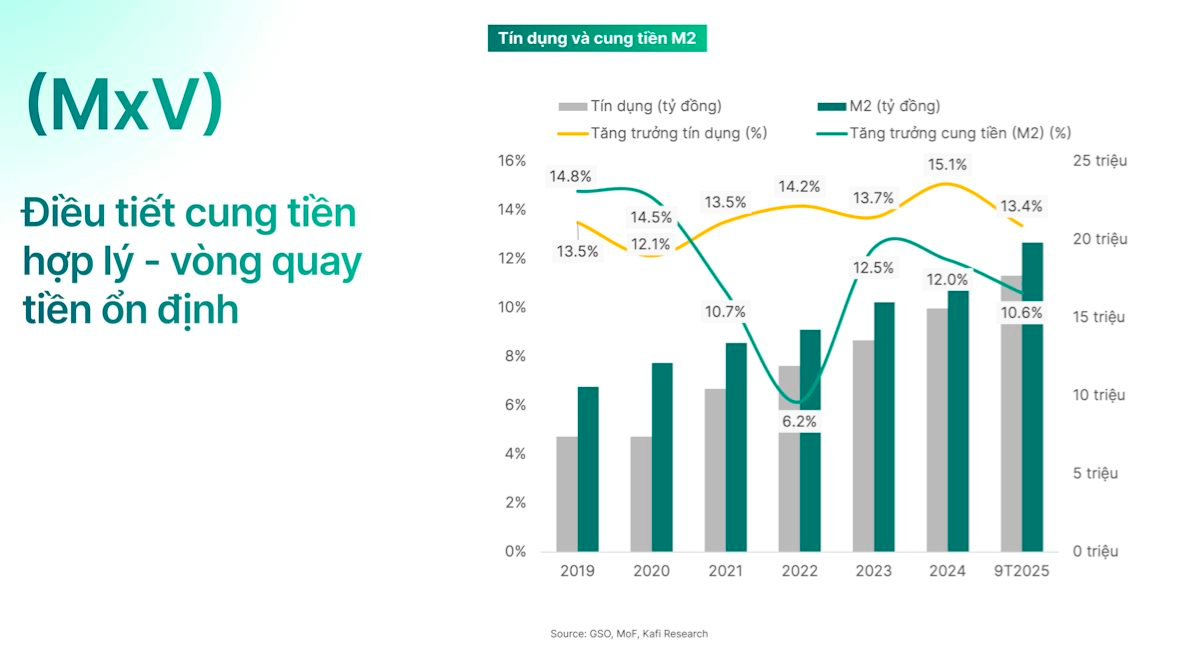 Ông Viết cho rằng giai đoạn 2020–2025, tăng trưởng cung tiền chậm hơn tăng trưởng tín dụng do có một dòng vốn ròng chảy ra khỏi Việt Nam. “Nếu mục tiêu tăng trưởng hai chữ số được đặt ra cho năm 2026, nền kinh tế bắt buộc phải đẩy nhanh tốc độ cung tiền. Trong đó, tiêu dùng và tín dụng sẽ đóng vai trò quyết định, với tăng trưởng tín dụng năm tới phải cao hơn con số 16% ước tính của năm nay”, ông nhấn mạnh.