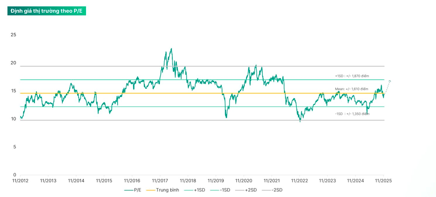Cuối cùng, yếu tố định giá đang trở thành điểm cộng đáng chú ý. P/E thị trường hiện quanh mức 14,5–14,7, thấp hơn mức trung bình lịch sử dù triển vọng tăng trưởng GDP và EPS đang cải thiện rõ rệt. Điều này cho thấy dư địa tăng giá vẫn còn lớn. Khi nhà đầu tư tin tưởng vào triển vọng tăng trưởng hai chữ số của nền kinh tế, họ sẽ sẵn sàng chấp nhận mặt bằng định giá cao hơn, từ đó tạo thêm động lực cho thị trường đi lên bền vững trong năm 2026.