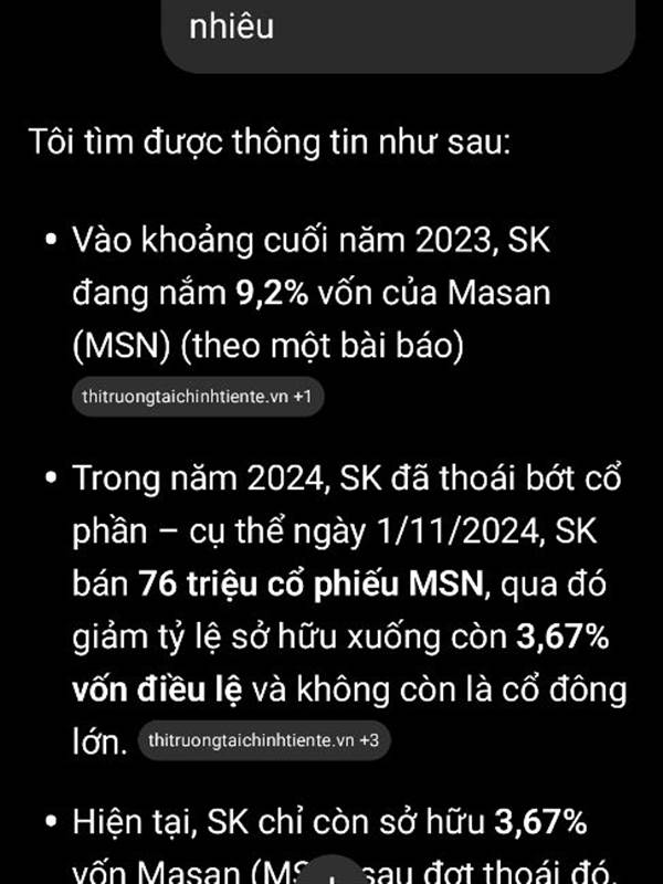 Sau đợt năm ngoái SK còn 3,67% tương đương 30,3 triệu MSN. Khả năng đợt rồi tây bán hơn tháng là SK thật. Nay là phiên đầu tiên mua ròng nhẹ sau hơn 1 tháng, có lẽ SK bán xong rồi