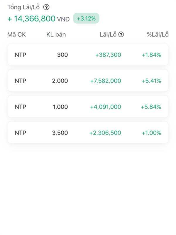 Hôm rồi tính ra xơi nhẹ NTP 14 củ thêm được 5 củ cổ tức là 19 củ. Bán giá 74 mà cứ sợ nó lên hẳn 90. Mai mà về 65 thì lại ngon quá, làm vòng mới, kk lần trước mua hơi ít do vào hơi muộn múc có 6k lần ...Thêm