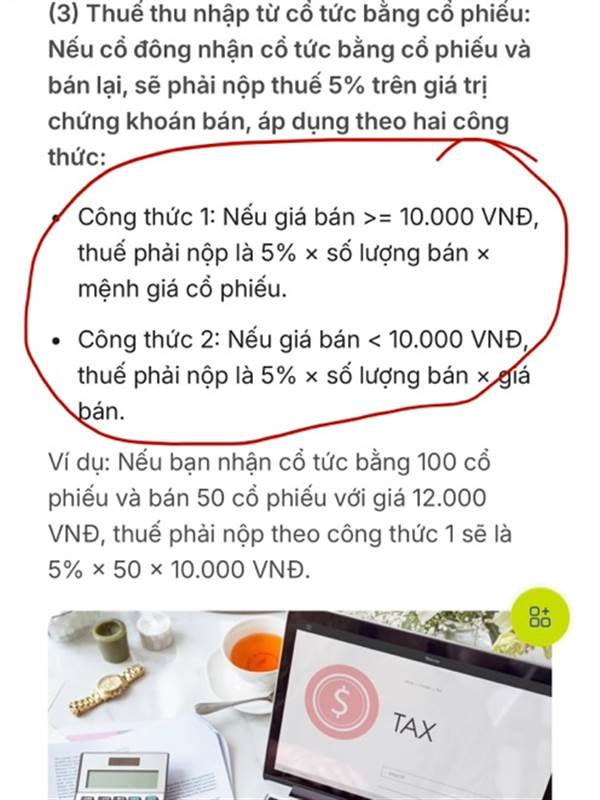 78saigon Thuế thu nhập từ cổ tức bằng cổ phiếu: Nếu cổ đông nhận cổ tức bằng cổ phiếu và bán lại, sẽ phải nộp thuế 5% trên giá trị chứng khoán bán, nó nói rõ như thế rồi mà cãi cố Tôi đến ạ