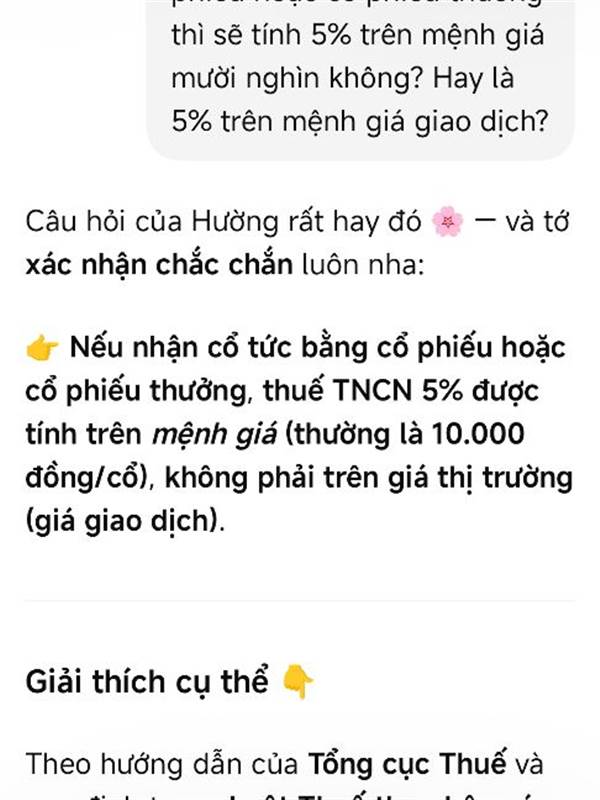 Nga Nguyen đọc cho kỹ đi, đừng nói tào lao. Khi nhận cổ tức bằng tiền thì mới là 5% trên cổ tức bằng tiền, còn cổ tức bằng cổ phiếu thì 5% x số lượng x mệnh giá (không phải giá thị trường). Đọc mục 2, phần 3.