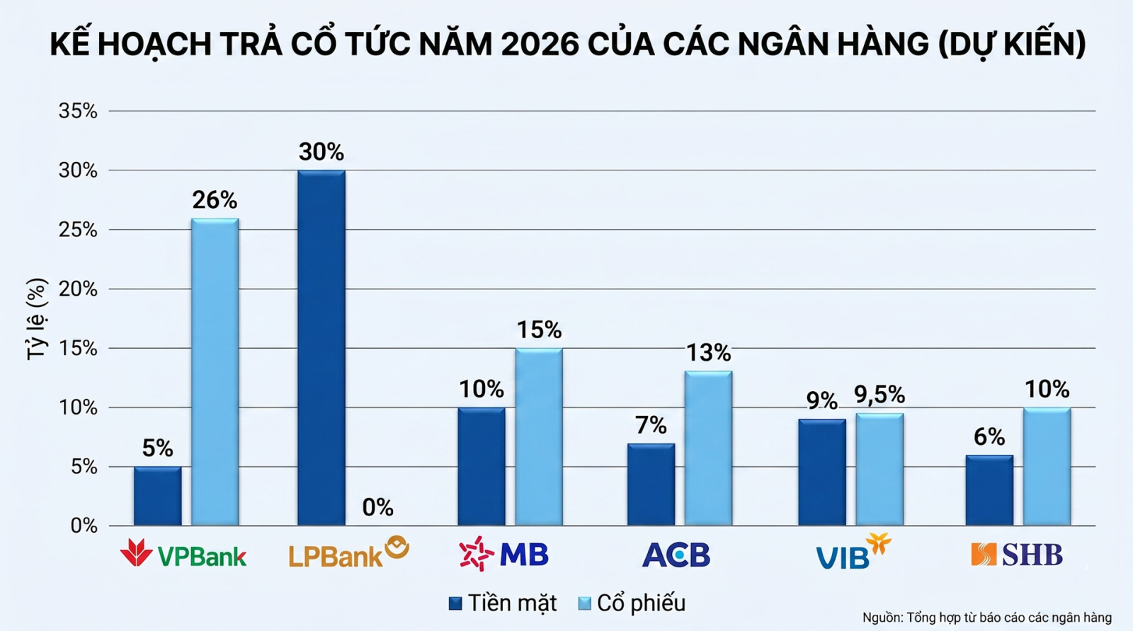 Năm 2025, có tới 12 ngân hàng thực hiện chia cổ tức tiền mặt, bao gồm Vietcombank, VietinBank, BIDV, MB, Techcombank, VPBank, ACB, SHB, TPBank, OCB, LPBank và VIB. Tổng số tiền chi trả ước tính lên tới khoảng 42.600 tỷ đồng. Trong đó, nhà băng chi đậm nhất là LPBank với tỷ lệ 25%.