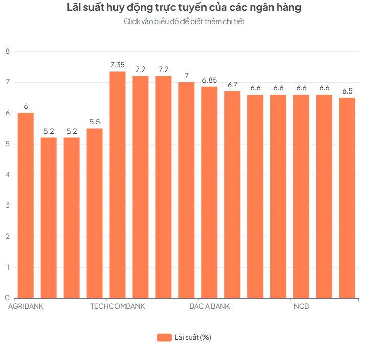 Trong đó, NCB gây chú ý với đợt tăng khá mạnh trên nhiều sản phẩm. Cụ thể, đối với tiền gửi trực tuyến lĩnh lãi cuối kỳ, NCB đẩy lãi suất các kỳ hạn dưới 6 tháng lên mức trần 4,75%/năm. Ở các kỳ hạn dài, mức tăng dao động từ 0,15 đến 1,1 điểm phần trăm. Điển hình là kỳ hạn 18 tháng tăng vọt lên 6,8%/năm và kỳ hạn 60 tháng lên 6,9%/năm. Riêng chứng chỉ tiền gửi kỳ hạn 24 tháng của ngân hàng này đã cán mốc 7,4%/năm.