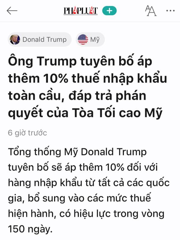 tốt bác nhé ,thuế 20% bị quốc hội mỹ bác bỏ ,nên trump áp thuế mới theo mục 122 của luật thương mại 1974 , luật này cho phép tổng thống áp thuế tối đa 15% lên hàng hóa nhập khẩu từ 1 hoặc nhiều quốc g...Thêm