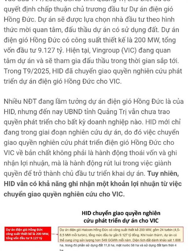 Minh Anh Nguyen Vic_ HID : hid phát triển điện gió trước Vic # 15 năm nên chỗ nào phát triển điện gió thuận lợi là có thể đã có dấu chân của HID. Ai vào sau thì phải qua HID chuyển quyền dấu chân! ( đoán mò)