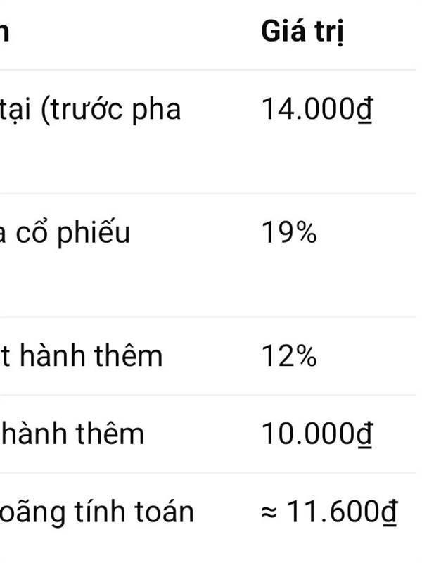 ĐTTM tôi tính nhẩm thôi vì công thức phức tạp. Đâu đó chia xong về 12.x bé. Chắc k đến 11.6, công thức k phải trừ 31% đâu