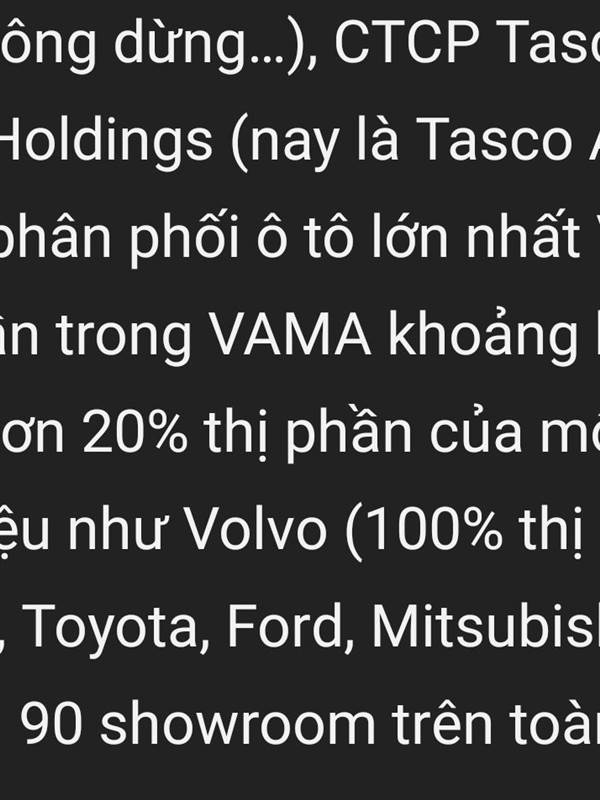 Tâm Như Phật Về Tasco, doanh nghiệp này đang phân phối nhiều thương hiệu xe ô tô như Toyota, Ford, Hyundai, Mitsubishi, VinFast, Honda, Nissan, MG, Suzuki…, chiếm 13,3% thị phần (theo số liệu của VAMA). Sau khi sá...Thêm