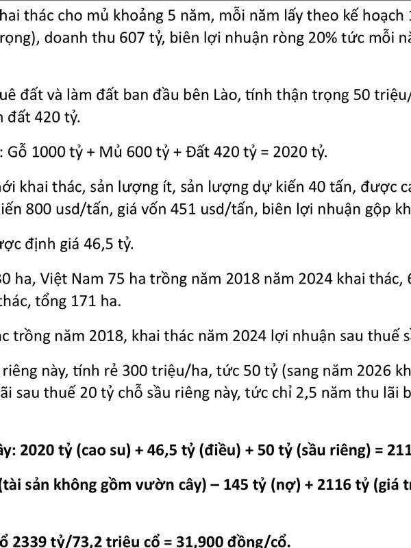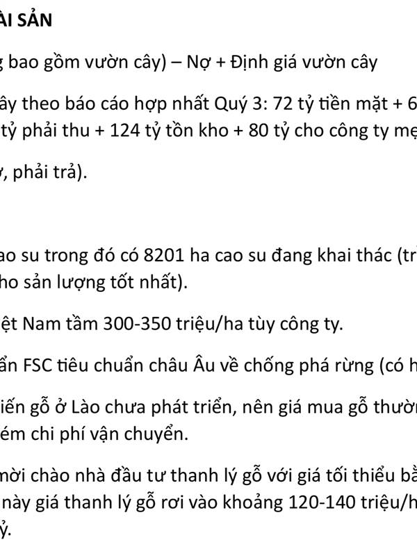 Rtb có 13.186ha với 88tr cổ phiếu=> 100k cổ = 15ha đất cao su; giá 30k/cổ => 200tr/ha