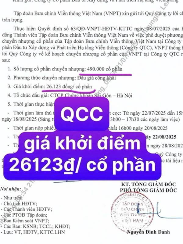 Qcc Vnpt thoái vốn thành công giá tối thiểu khởi điểm 26123₫/cp