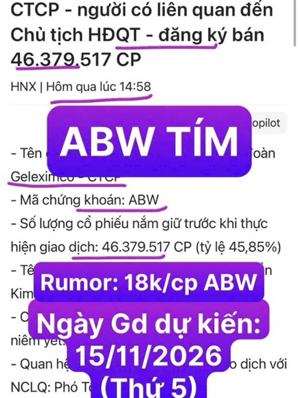 Ngày mai 15/1/2026 dự kiến Geleximco sẽ thoái toàn bộ vốn khỏi abw. Giá rumor 18k