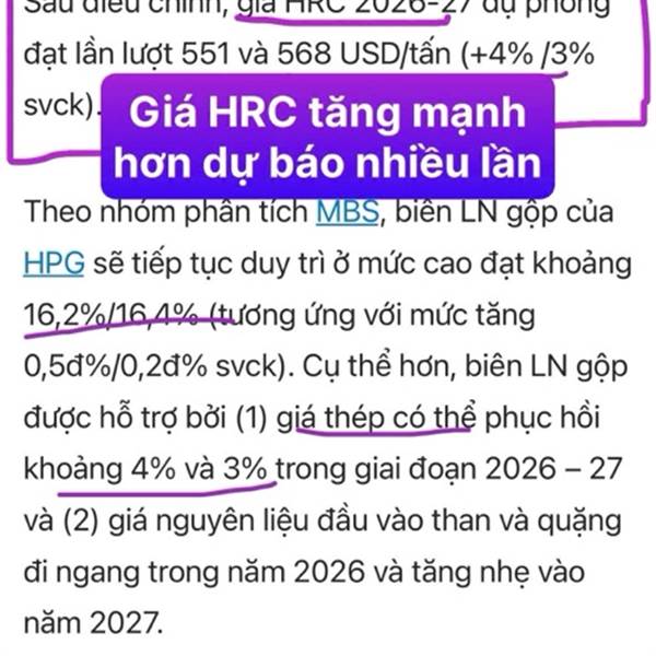 Lnr của Hpg có thể tăng trên 50% cao hơn nhiều so với dự phóng của mbs do giá hrc đang cao gần gấp đôi dự báo