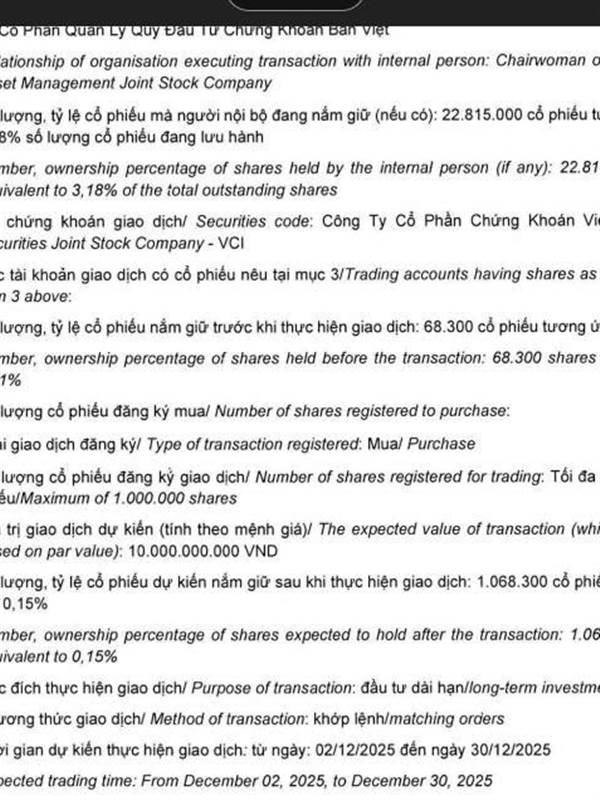 Công ty quản lý quỹ chứng khoán Bản Việt đăng ký mua 1.000.000 cổ phiếu VCI, bắt đầu thực hiện từ 02/12/2025 đến 30/12/2025, đáng chú ý hiện tại công ty này mới chỉ nắm giữ 68.300 cổ phiếu