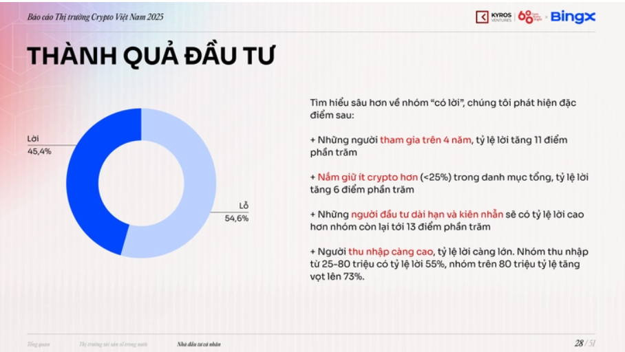 Trong khi đó, thu nhập cũng là yếu tố tạo ra sự phân hóa mạnh. Nhóm thu nhập 25-80 triệu đồng/tháng có tỉ lệ sinh lời khoảng 55%, trong khi nhóm trên 80 triệu đồng/tháng đạt đến 73%, cho thấy những người có nguồn lực tài chính tốt hơn thường ra quyết định tỉnh táo và có khả năng nắm giữ lâu hơn.