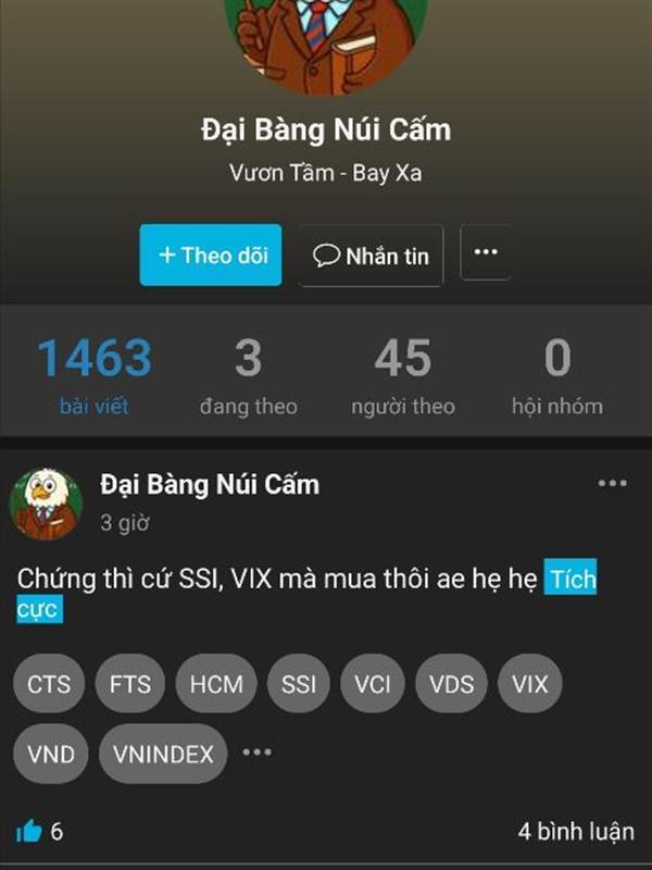 Đại Bàng Núi Cấm hay chú m cay cắt lỗ r vào hô cắt chung giống m ah. T đoán chỉ có trung' tim đen....nhỏ lẻ như m post bài nhiều mà lãi đâu dc bao..đâu bằng mấy tay to hold lúc sập.