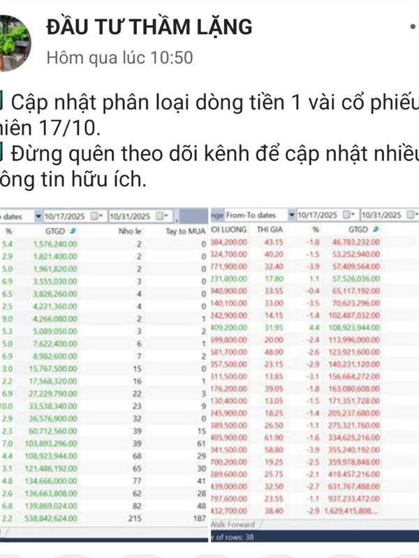 đây mới uy tín nè. Giá trị giao dich của DXG phiên 17/10 là 1.216 tỷ (trong đó nhỏ lẻ mua bán 463 tỷ chiếm tỷ trọng 38% giá trị giao dịch, còn lại tay to mua 425 tỷ, và tay to bán ra 327 tỷ => tính ...