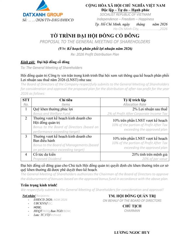 Đất Xanh kế hoạch chia cổ tức 2026 là 20%/mệnh giá...