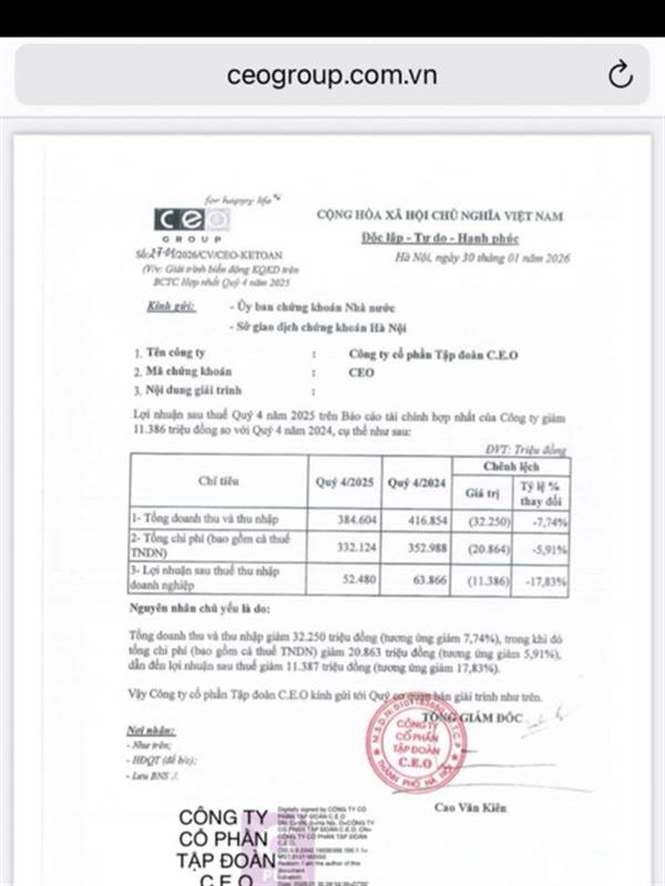 CEO vừa công bố bctc quý 4/2025, lợi nhuận sau thuế đạt gần 34 tỷ, giảm 48,4% so với cùng kỳ.