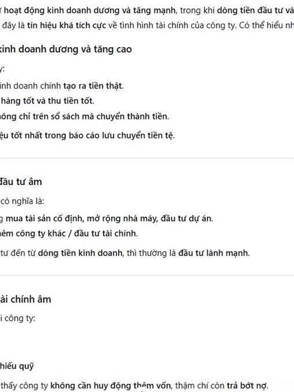 Tùng Nguyễn Thanh đúng ạ, dòng tiền tài chính và đầu tư âm là Cty đang đem tiền đi đầu tư(mở rộng kd chẳng hạn) đó ạ, còn dòng tiền kinh doanh thuần dương là tốt vì họ đang hoạt động sx có thu tiền về tốt ạ, rồi tiền đ...Thêm