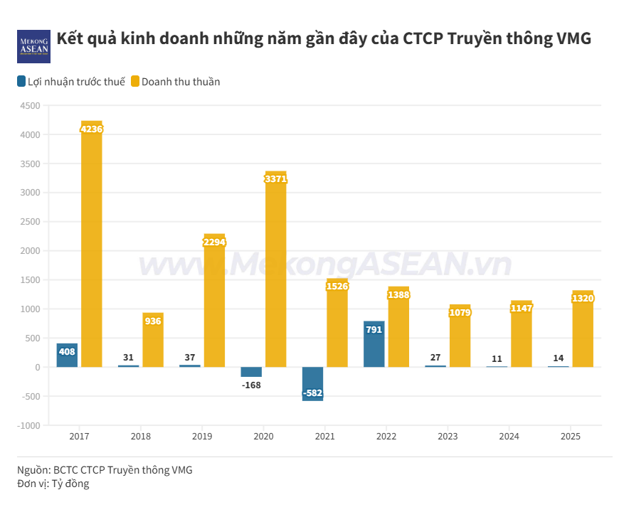 Lũy kế cả năm 2025, Truyền thông VMG đạt doanh thu thuần hơn 1.320,4 tỷ đồng, tăng 15% so với năm 2024, đồng thời là mức doanh thu cao nhất kể từ năm 2023 đến nay. Lợi nhuận trước thuế của doanh nghiệp tăng 27,3% YoY, lên 14 tỷ đồng.
