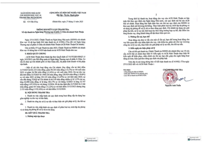 Kết luận thanh tra Ngân hàng ACB chi nhánh Ninh Thuận.