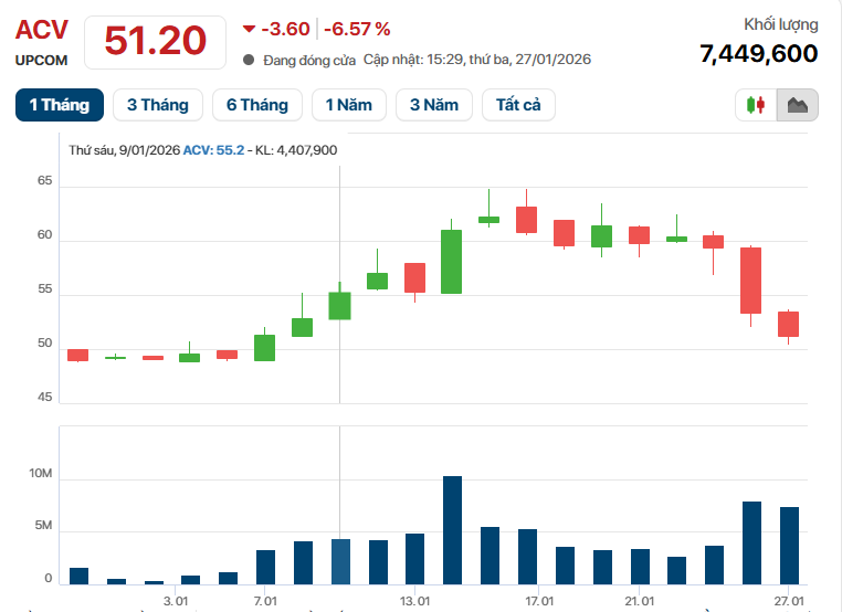 Cổ phiếu ACV tiếp tục tiếp tục giảm mạnh 6,57% trong phiên 27/1.