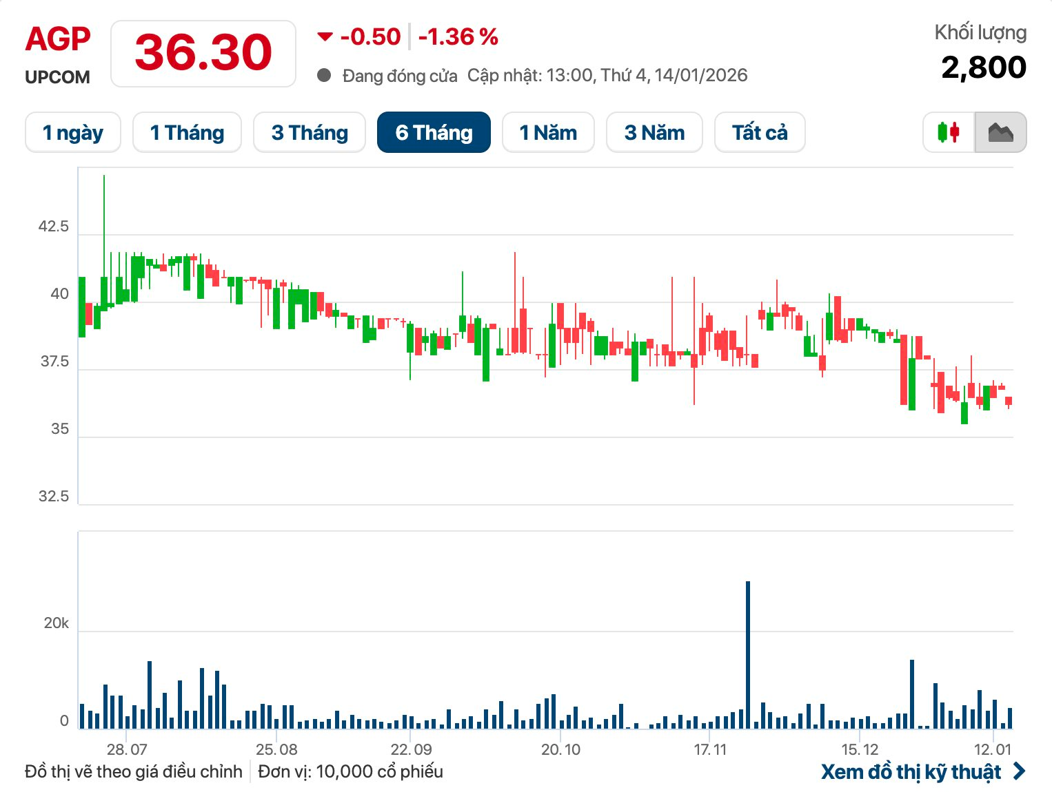 Kết phiên giao dịch ngày 14/1, cổ phiếu AGP có giá 36.300 đồng/cp. Vốn hoá thị trường đạt hơn 1.000 tỷ đồng.