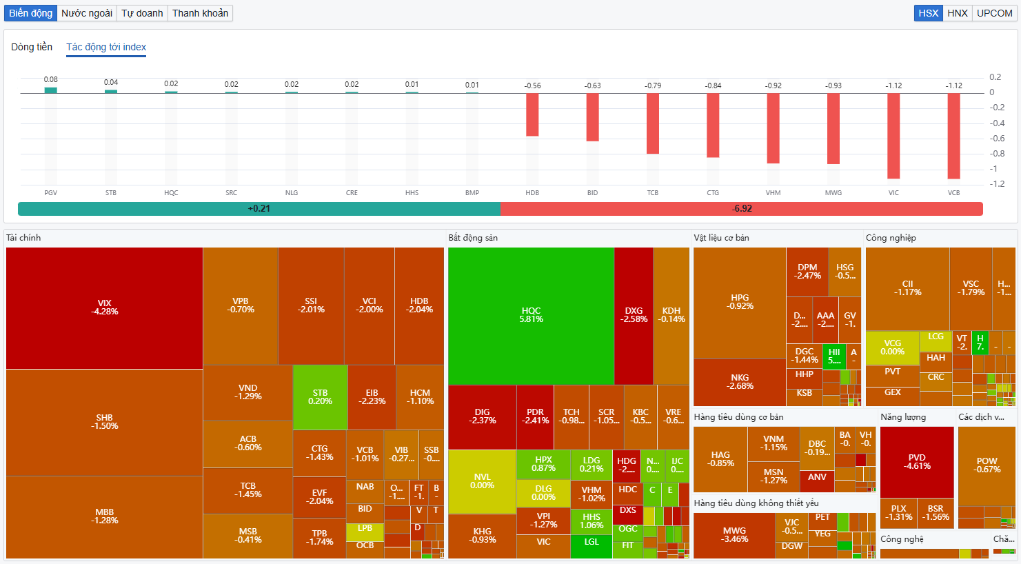 Tại nhóm cổ phiếu trụ cột ngân hàng, chỉ còn 2 mã tăng giá, trong khi 22 mã giảm. Các cổ phiếu lớn như VCB, CTG, BID, TCB đều mất hơn 1%, gây áp lực giảm giá lên thị trường chung.