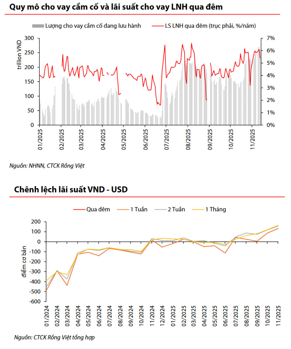 VDSC cho rằng, Ngân hàng Nhà nước tiếp tục điều tiết thanh khoản hệ thống thông qua nghiệp vụ mua kỳ hạn theo hướng hỗ trợ vừa phải trong tháng 11, trong khi áp lực cân đối thanh khoản VND chưa hoàn toàn hạ nhiệt. Ở phiên cuối tháng 11, doanh số cho vay qua đêm vọt lên mức kỷ lục 1,03 triệu tỷ đồng, trong khi lãi suất liên ngân hàng duy trì ở mức cao (5,4%).