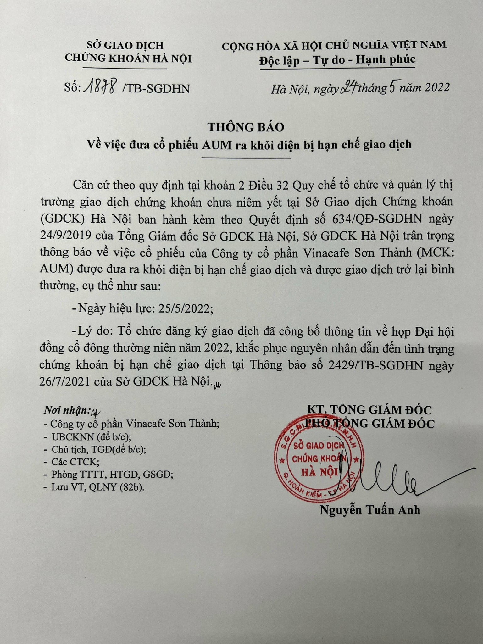 AUM: Thông báo về việc đưa cổ phiếu AUM ra khỏi diện bị hạn chế giao dịch